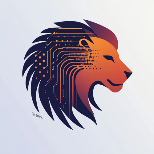logo for software company called "Greplion", A stylized digital lion head with its mane formed by lines of code, The lion's eye designed to look like a search icon, primary color is deep orange, secondary color is blue or charcoal, with white or grey accent, minimalistic design elements