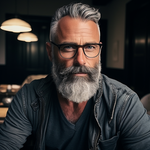 a 47 year old man with grey beard, black glasses and shaved reclining hairline, a big forehead