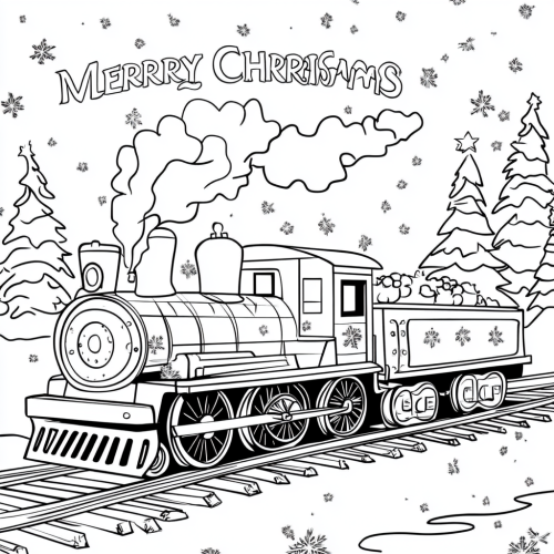 b&w coloring page for children, christmas train, minimalistic design, art line, abowe the train is the title MERRY CHRISTMAS suitable to color --no shading