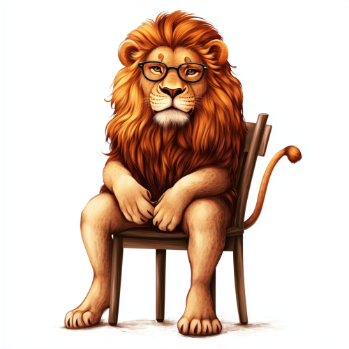 lion seated on the chair, king of jungle, wearing eyeglass, funny vector imagine for children book illustartion , vivid illustartion. white background