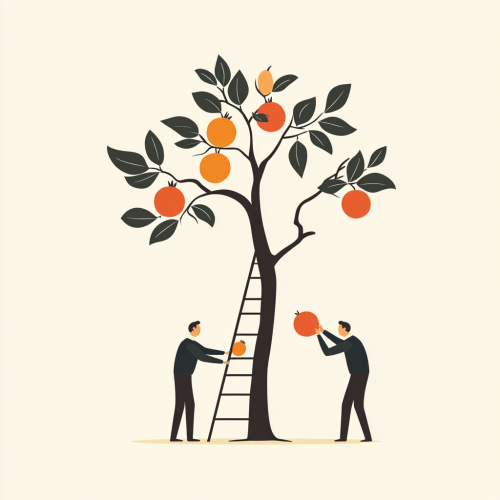 uma imagem minimalista de cartoom Três pessoas estão tentando alcançar uma fruta em uma árvore. A primeira pessoa tem uma escada alta e consegue pegar a fruta facilmente. A segunda pessoa tem uma escada mais curta e consegue alcançar apenas algumas frutas. A terceira pessoa não tem escada e não consegue alcançar a fruta.