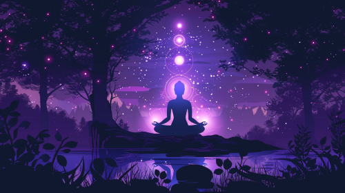 flat character, flat vector art, flat elements, chakra meditation, nature, minimalistic, purple colors, --ar 16:9