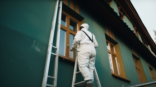 realistic photo of fully body shot, A Japanese worker wearing work clothes and a helmet climbs a ladder and painting the exterior wall of beautiful house, he has a roller in his hand --v 5.0 --ar 16:9