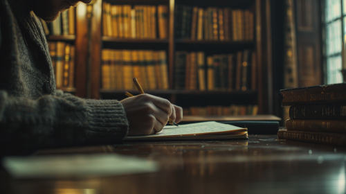 photograph, a man writes with a pencil in a library, high detail, 8k, realistic --ar 16:9 --v 6.0