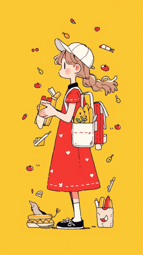 cute cartoon, A cute girl with snacks,full body, (solid color) background, doodle in the style of Keith Haring, sharpie illustration, bold lines and solid colors, simple details,minimalist,,4-pixel stroke,8k --ar 9:16 --s 250 --niji 5 --style cute