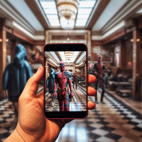 a highly realistic indoor scene shot on an iPhone 15 camera. The subject is a person dressed in a precise, movie-accurate Deadpool 2 cosplay outfit, doing a silly pose. In the background there are other people dressed in various detailed superhero costumes from Marvel and DC universes, including characters like Spider-Man, Wolverine, and Harley Quinn. The setting is an indoor comic-con event, with vivid lighting and detailed shadows. The camera captures a realistic and sharp image, with lifelike textures on the costumes, natural light reflections, and subtle depth of field effects, making the photo look like it was captured in a real environment. --v 5.0