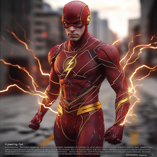 "A powerful, lightning-fast superhero inspired by The Flash standing confidently in a cinematic 16:9 format. The hero is wearing his sleek, red suit with golden accents, designed to minimize air resistance and enhance speed. Glowing yellow lightning bolts run along the edges of his suit, crackling with energy as he channels the Speed Force. His iconic lightning bolt emblem is prominently displayed on his chest. The background shows a blurred cityscape in motion, emphasizing his super speed, with streaks of red and yellow light trailing behind him. The Flash stands on a cracked road, his posture reflecting readiness and agility, while glowing lightning arcs around him, symbolizing his connection to the Speed Force and his ability to move faster than anyone else."