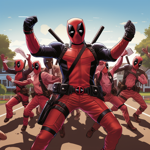 Deadpool’s Tactical Kick Description: Deadpool, with a mischievous grin, performs a tactical kick aimed at Wolverine’s midsection. The animation showcases Deadpool’s clever and unpredictable move, with vibrant colors and energy effects surrounding his foot. Wolverine, although surprised, braces for the impact. The scene is lively and fast-paced, with the action accentuated by animated lightning and motion blur. --ar 3:2 --style raw --stylize 0 --v 6.1