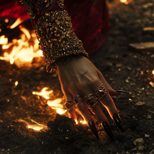 Red Female hand signalling the Karana Mudrā breaking through the ground with fire and flames, album cover, 4k, high definition, album art, heavy metal --chaos 10 --v 6.1