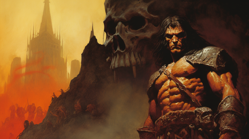 1970's dark fantasy cover art by Frank Frazetta, dungeons and dragons style drawing of Glob is a towering figure at 6'6", an imposing blend of human and orc heritage. His human side is noticeable in the cascade of long, red braids inherited from his mother, a contrast to his more orcish features. His skin carries a muted brown tone, a testament to his mixed lineage. From his orcish heritage, he possesses small but distinct tusks that jut from his mouth, hinting at his formidable bloodline. His eyes are a striking mismatch of colors, with one red and the other brown, capturing attention and hinting at his unique ancestry. A prominent scar marks his visage, a souvenir from combat that travels from his left eye, across his nose, to the corner of his right eye. Glob's personality is as straightforward as they come, a binary yes or no attitude shaping his interactions. with minimalist far perspective --ar 16:9 --style raw