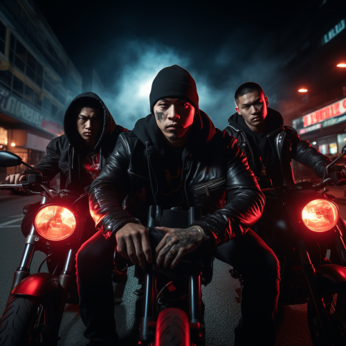 Create a wide screen frame hyper realistic group of back lit punk rocker asian gang members at night, wearing black vinyl jackets with red cobra emblems on sport motorcycles with glowing headlights. Use a Sony α7 III camera with a 85mm lens at F 1.2 aperture setting to blur the background and isolate the subject. Background is a night scene lit only by lamps at a wet shipyard where an old Chinese cargo ship is docked.. The image in high resolution and in a 9:16 aspect ratio. Use the Midjourney v5 with photorealism mode turned on to create an ultra-realistic image that captures a life-like quality.