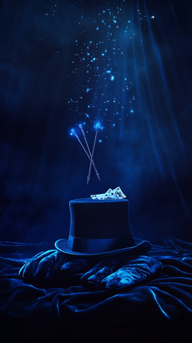 Design a mobile slide background featuring a magician’s top hat and a pair of gloves placed on a dark velvet stage. The top hat, slightly tilted, has magical props like wands and playing cards subtly emerging from it. The background should be a deep, textured black with a velvet or silk appearance, creating a sense of mystery and sophistication. Incorporate subtle dark blue highlights and shadows to complement the neon blue content color. Soft spotlights should illuminate the top hat and gloves, casting dramatic shadows and ensuring a striking contrast against the neon blue text. This dark, nuanced color scheme will ensure that the neon blue content stands out clearly and effectively against the background. --ar 9:16