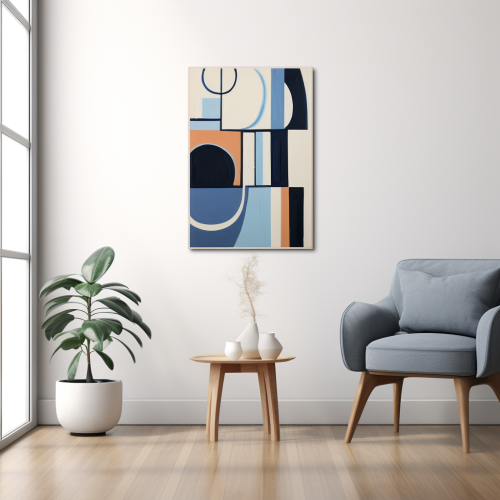 Design a modern abstract painting that captures the reflection of a city skyline, using deep blues, greys, and hints of metallic gold. The composition should feature vertical shapes that resemble skyscrapers, blurred with soft edges and reflections. Create a feeling of calm within the urban chaos, with smooth transitions and subtle textures to evoke the serenity of a city at night --ar 2:3
