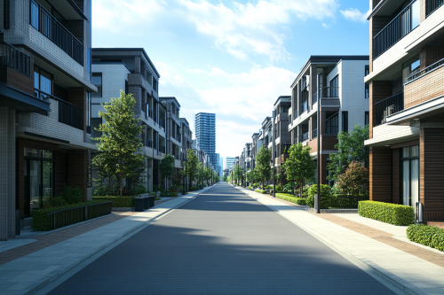 Upscale Japanese residential area with a focus on luxury condominiums, tall buildings with polished facades and balconies, clean urban streets, well-maintained sidewalks, minimal street furniture, modern street lighting, creating a sense of high-end urban living. Photorealistic, highly detailed, 8K resolution --ar 3:2 --v 6.1 --style raw