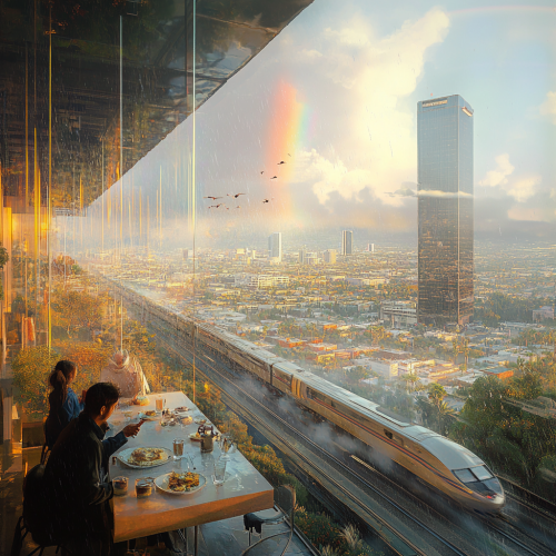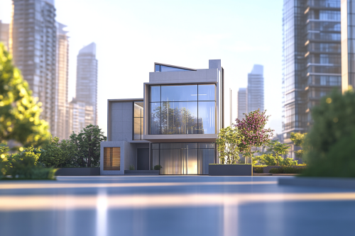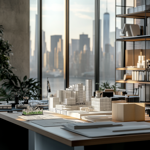A modern architect's office, displaying multiple building models on the desk, with a panoramic city view in the background, warm natural light illuminating detailed blueprints and material samples, modern industrial decor, taken on a Canon EOS R5 F1.2 ISO100 35MM
