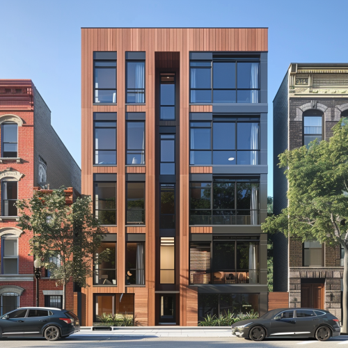 Upscale apartment building with a refined facade, using dark glass panels, polished stone cladding, and detailed metal railings, well-maintained entrance area, emphasizing a sense of exclusivity and a heavy, luxurious feel. Photorealistic, highly detailed, 8K resolution --ar 3:2 --v 6.1 --style raw