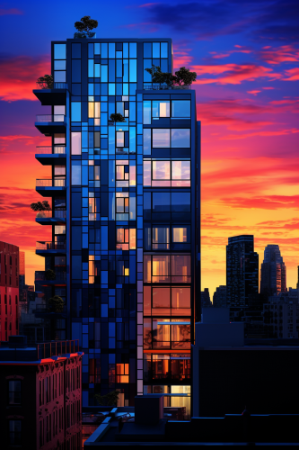 High-end apartment building exterior, characterized by dark-tinted glass, sleek metal accents, and robust stone elements, situated in a high-class urban area, with neatly landscaped surroundings, representing a prestigious city residence. Photorealistic, highly detailed, 8K resolution --ar 3:2 --v 6.1 --style raw