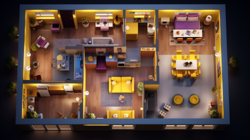 a room in a small modernist city apartment. There are a few plants and Josef Albers prints on the walls. The focal length of the camera is 25mm, and it's placed in one corner at about 1.5 meters off the floor. --ar 16:9
