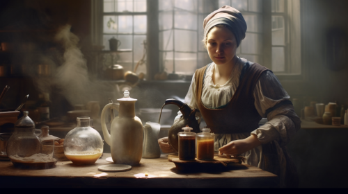 A modern twist on Vermeer's "Melkmeisje". The scene is set in a bustling 21st-century coffee shop. The Milkmaid, now a skilled barista, is in the midst of crafting a cappuccino, with steam swirling around her. The backdrop features patrons on their laptops and chatting at tables. Medium: Ultra-detailed photography. Style: A fusion of classical art and today's cafe culture. Lighting: Overhead warm lights combined with the cool glow from laptop screens. Colors: A palette of muted grays, whites, and the rich browns of coffee. Composition: Captured with a Nikon D850, using a 35mm lens, Resolution 45.7 megapixels, ISO: 64, Shutter speed 1/100 second. The barista is centrally framed, with the surrounding cafe life adding depth and context. --ar 16:9 --v 5.1 --style raw --s 750