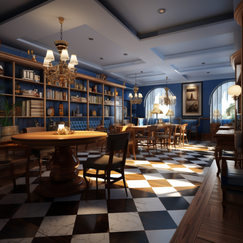 Chess focused bar and coffee shop, small library behind the bar, arcitecture rendering, detailed measurements, wood floor, tables with chess sets, classy enviorment, blue print