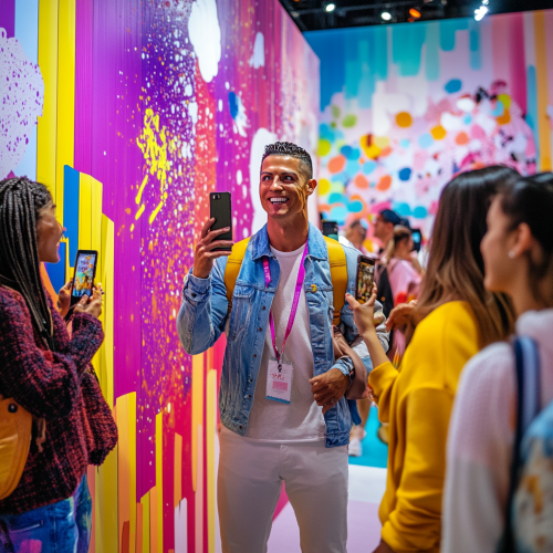 A zone in an entertainment exhibition called: Celebrity and Influencer Meet-and-Greets: Exclusive Sessions: Arrange meet-and-greet opportunities with industry celebrities, influencers, or thought leaders, including photo ops and autographs.The zone theme should be characterized by a vibrant color palette, including fuchsia, blue, yellow, purple, and white, to enhance the visual impact and overall atmosphere. The zone should include the famous celebrity Christiano Ronaldo with Saudi people taking pictures with them.