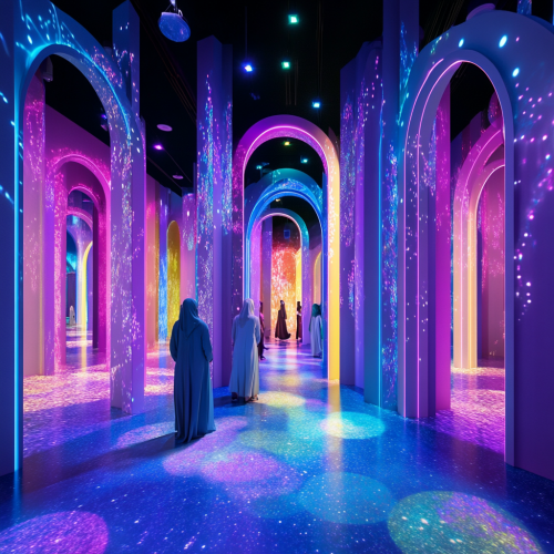 A zone in an entertainment exhibition called: Tech-Enhanced Networking: Smart Badges: Use RFID or NFC-enabled badges that allow attendees to exchange contact information and track interactions seamlessly. The zone theme should be characterized by a vibrant color palette, including fuchsia, blue, yellow, purple, and white, to enhance the visual impact and overall atmosphere. The zone should include Saudi people.