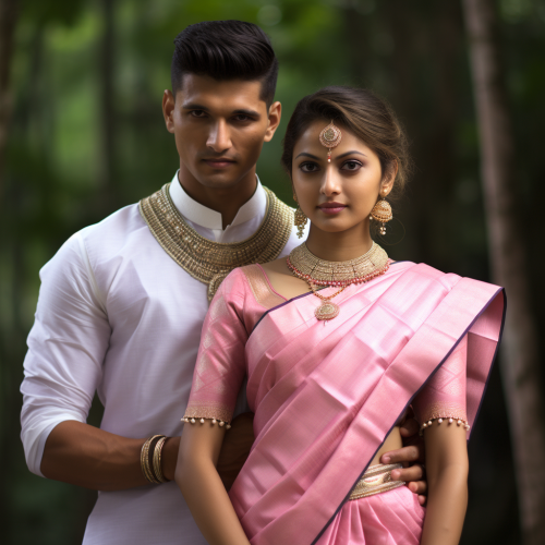 indian couple images in a brahmin traditional dress and the the girl wears a pink color saree and the boy wear a white dress with pink shade on it