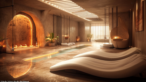 Luxurious and modern Spa room for "Nuzha" means a secluded and delightful place, reflecting the retreat's serene and exclusive nature. Together, the name "Sahara Nuzha Retreat" captures the Arabic essence while conveying the unique and tranquil experience offered by the resort in AlUla, Saudi Arabia. Cinematic lighting --ar 16:9 --v 6.0 --s 250