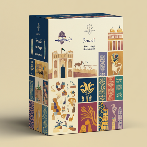 Design the packaging for a Saudi heritage-inspired Rummikub set. The box should have a modern, elegant look with cultural elements. The front of the package features a rich design, incorporating symbols from the tiles, such as the Masmak Fort, Al-Qatt Al-Asiri patterns, Arabian hare, camel, Arabian horse, and palm trees. Use calm colors inspired by the Saudi landscape--desert tones, sea blues, palm greens, and lavender purples. The title "Saudi Heritage Rummikub" is prominently displayed in both Arabic and English, with intricate geometric borders that reflect traditional Saudi art. The box is sturdy, with a smooth matte finish, and has a magnetic closure. The back of the package showcases an overview of the game, highlighting the unique numbered tiles from 1 to 13 with their individual designs. Include a brief description of the game and the cultural significance of the symbols used. The package should feel luxurious and collectible, reflecting the fusion of tradition and modernity in Saudi design.