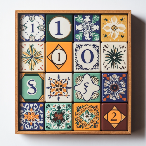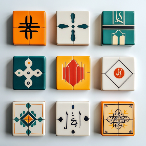 Design a modern and youthful set of rummy tiles inspired by Saudi heritage, with a focus on calm, classy colors. Each tile features a large Arabic numeral centered, with a small symbol in the upper right corner representing various Saudi regions. Incorporate abstract designs inspired by: Sadu patterns from the north, Najdi doors from Riyadh, Western and Hasawi architecture, blending each symbol subtly with the tile. Use the colors and feeling of Saudi regions – soft desert tones, deep teals, and muted earthy hues. The overall aesthetic should feel refined yet vibrant