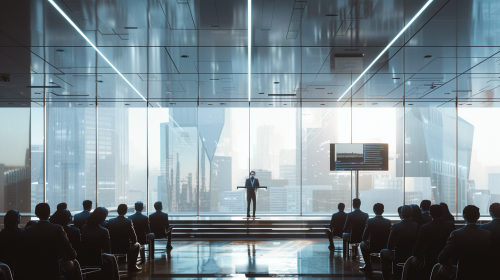A highly modern courtroom with futuristic lighting and transparent panels, a young educator stands mid-speech at a digital lectern, with large windows showing a cityscape in the background. The audience, dressed in modern business attire, listens intently. Created Using: contemporary architectural elements, soft lighting, bright tones, sleek textures, futuristic courtroom design, high-contrast, professional capture --ar 16:9 --v 6.0
