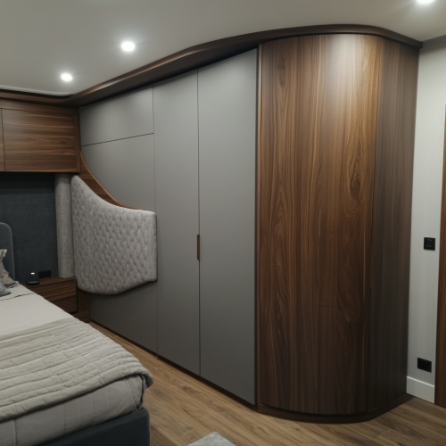 Actual image of 30m2 bedroom, modern style. The wardrobe has a curved outer corner opposite the bed with an upholstered headboard. Gray and white color scheme. Small straight wooden floor in walnut color. Photos taken with Samsung, real and authentic photos