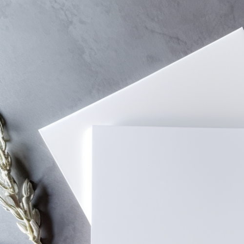 a close up of two blank 5 inch by 7 inch card laying on a table. surroundings are a modern pastel WHITE wedding. bright natural lighting. top aerial view. --v 5.1