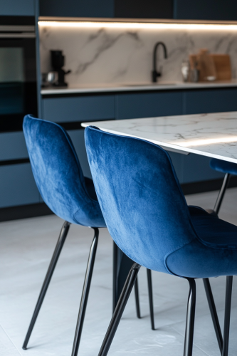 A blue minimalist sofa, white background with an arched arch in the middle of it, featuring geometric shapes and streamlined design. The armrests on both sides have soft lines, creating a simple yet fashionable atmosphere. It is placed on top of a circular stand with rounded edges, adding to its overall sense of unity and balance.,,in style --ar 16:9