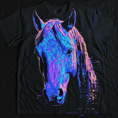 Create a T-shirt in a Y2K aesthetic, featuring a blurred and glitchy image of a horse's face on the front. The horse's face should be in a deep blue hue, giving it a mysterious, ethereal vibe. The background of the shirt is black, with a worn, slightly distressed fabric texture. The horse image should have a pixelated, lo-fi look, as if it’s a low-resolution image from an old screen. Ensure the shirt style reflects early 2000s fashion, with a loose, oversized fit and subtle faded details around the collar and seams.