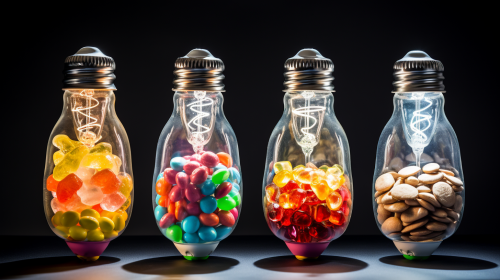 a big group of light bulbs where only one of them is turned on while the rest of them are turned off, realistic, 8k, uhd, realistic, detailed