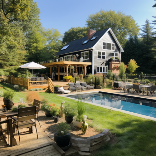 wide view of a large expansive backyard that has a medium large modern pool w seats, seperated by fence with a chicken-coop farm and then another section of the yard dedicated to an organized garden with tomato plants, herbs and spices backing up to a stone, black white Rustic farmhouse