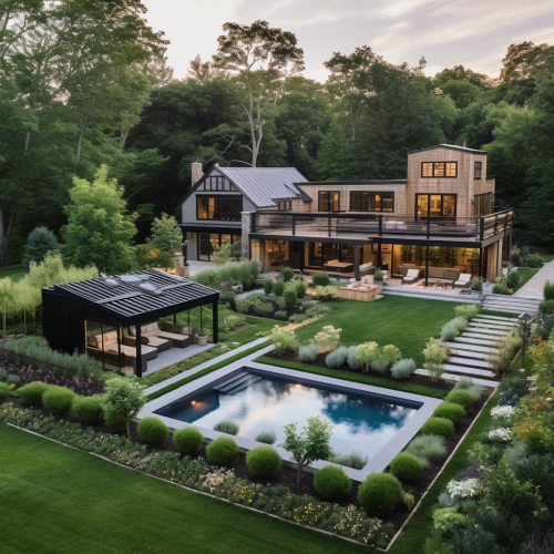 a wide aerial view of a large backyard with a small farm, large pool, fireplace w chairs on a patio that is behind a modern farmhouse with trees and heavy landscaping with both dark slate board-and-batten and light-colored board-and-batten and horizontal lap siding, a mix of dark shingle and metal roofing, black-framed double-hung windows, multi-gable roofline. lighting is cinematic