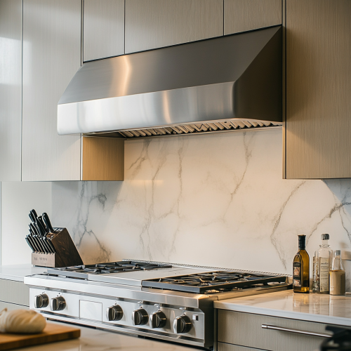 Capture a hyper-realistic shot of a stainless steel range hood in a modern kitchen, highlighting its sleek design and the soft reflections from ambient lighting.