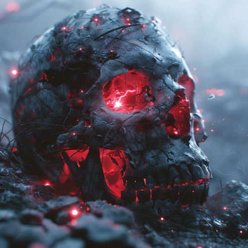amazing skull with horror elements and terrifying extraterrestrial matter, light coming out of the eye sockets and jaw, amazing dynamics, amazing detail, blended background, frontal positioning, light emphasizing horror, light from below, 8k, --s 750 --c 50 --v 6.0