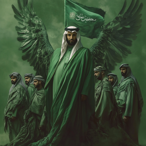 Saudi National Day, I would like to depict it in olive colors, with the Saudi people wearing the Saudi flag, standing like falcons, protecting their prince, His Royal Highness Prince Mohammed bin Salman bin Abdulaziz