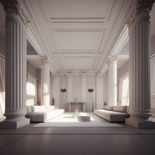I want to make a living room designed by designer Giancarlo valle. This is about 20 square meters. The ceiling is 2500 mm high. There are Ionic columns and walls. The wall is made of white wainscoting molding. but Minimal style.