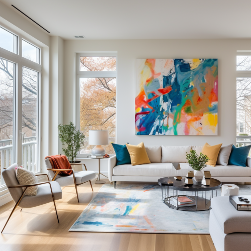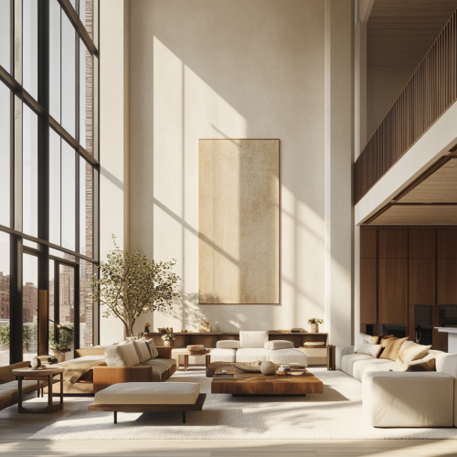 Spacious living room interior, showcasing a sophisticated blend of contemporary and Japandi styles. High ceilings and expansive windows allow natural light to illuminate the space. A warm color palette with wood and beige accents, a sleek, low-profile sofa, and a large piece of art as the focal point on a clean, white wall. Beautiful people are sitting smiling--v 6.1 --v 6.1
