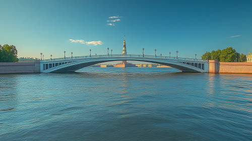 A photograph of the open white bridge in St. Petersburg at night, with the Peter and Paul Fortress tower visible behind it. The background is a blue sky with orange light from the sunset. In front, the Neva River flows under the drawbridge --ar 16:9 --s 750