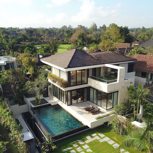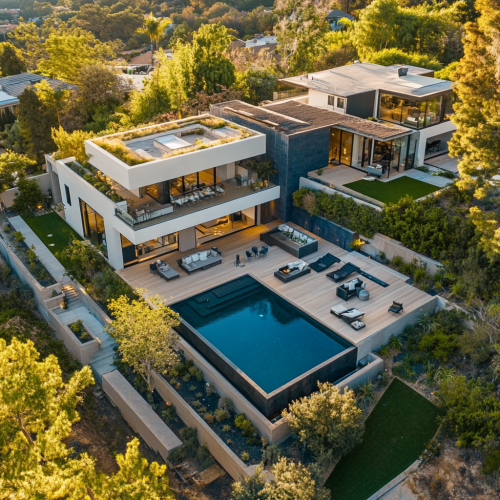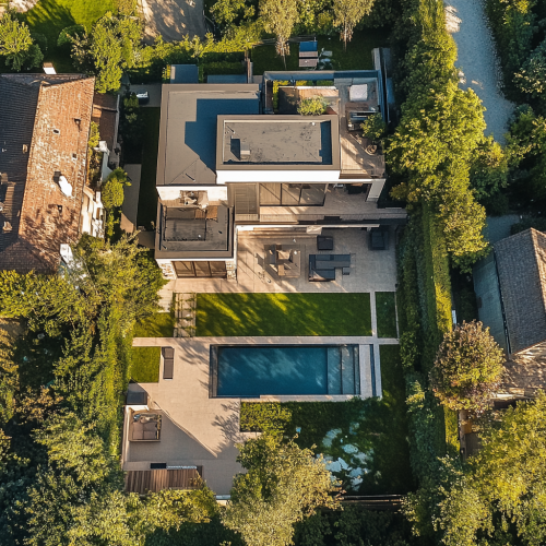 a drone aerial shot of a property that includes a modern main house with stylish rooftop terrace, pool in the middle of the property, and a small detached guest house to the back.
