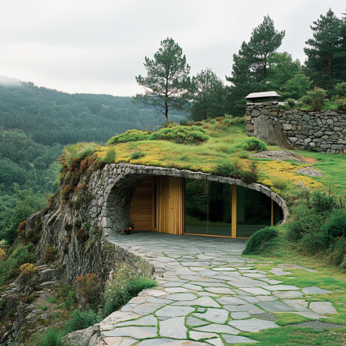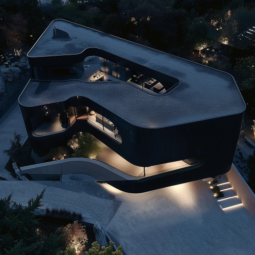 an aerial view of a black innovative house, in the style of isaac julien, organic stone carvings, 32k uhd, desertwave, minimalist sets, poolcore, rustic futurism, in the outskirts of london, minimalist, luxury, stylish, white lighting from below up to the front of the house
