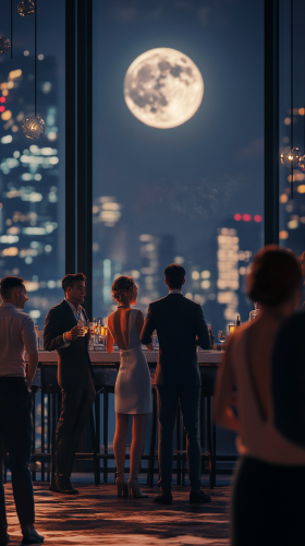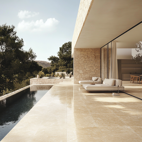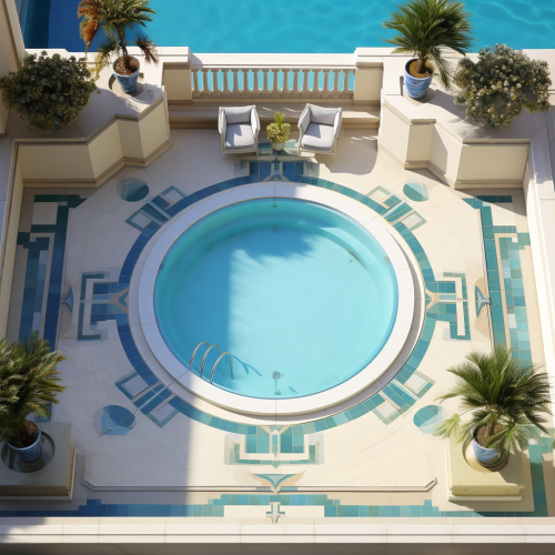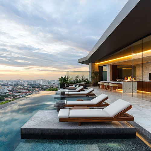 Imagine the rooftop of a luxurious urban mansion, designed as an exclusive retreat with breathtaking views of the city skyline. The space features a large infinity pool that blends seamlessly with the horizon, its water reflecting the golden hues of the setting sun. Surrounding the pool, there are minimalist sun loungers made from polished teak wood with soft, white cushions. The flooring is made of large, textured stone tiles that provide a natural yet elegant contrast to the sleek pool design. A shaded area features an outdoor kitchen with a marble-topped bar, equipped with state-of-the-art grilling appliances and a sleek built-in fridge, perfect for entertaining. Modern glass balustrades ensure unobstructed views of the city, while integrated LED strip lighting along the edges of the rooftop and pool adds a soft, ambient glow as night falls. Potted plants in minimalist concrete planters add a touch of greenery, bringing a natural element to the ultra-modern space. A fire pit with built-in seating provides a cozy spot to relax, surrounded by the lights of the city.
