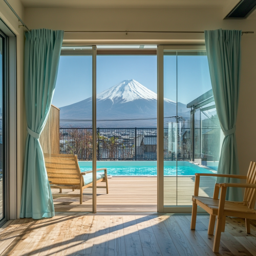 A dream house interior shot in the style of a Misba Dero architect, with the living room seamlessly extending into an outdoor swimming pool. Beyond that, the ocean is visible, and the sun is setting on the horizon. Architectural style, --style raw --s 50