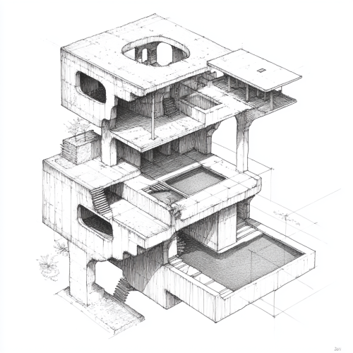 a wide camera shot in north east isometric view of a building having four levels and a terrace with the pool , the roof having a culvinear structure (like an inverted umbrella), the image is a sketch