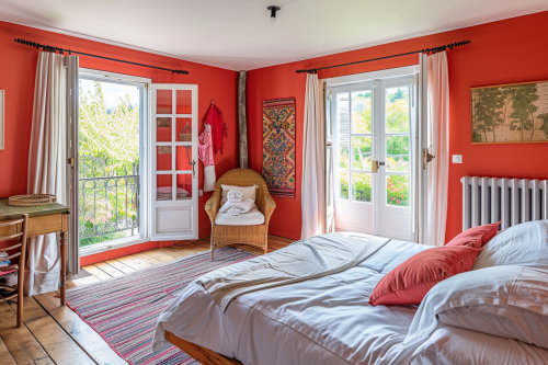 DSLR photo of a bright, modern guest room with red-painted walls in a house in France --ar 3:2